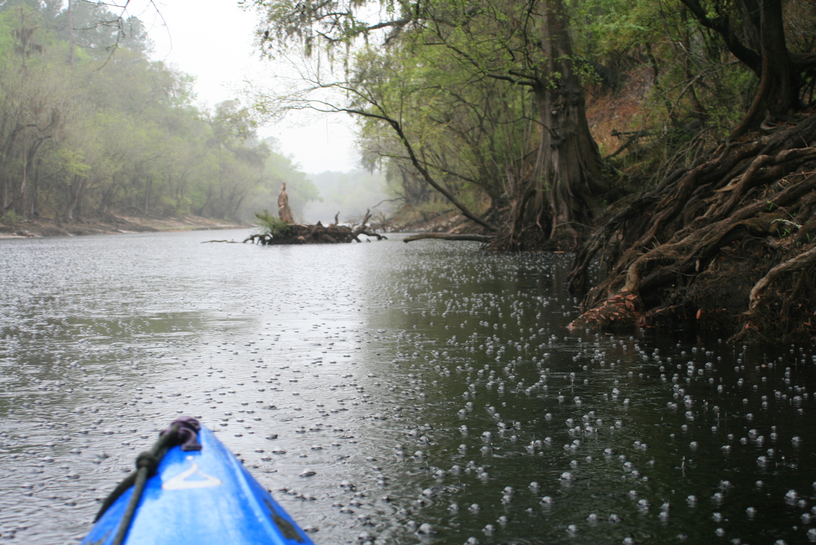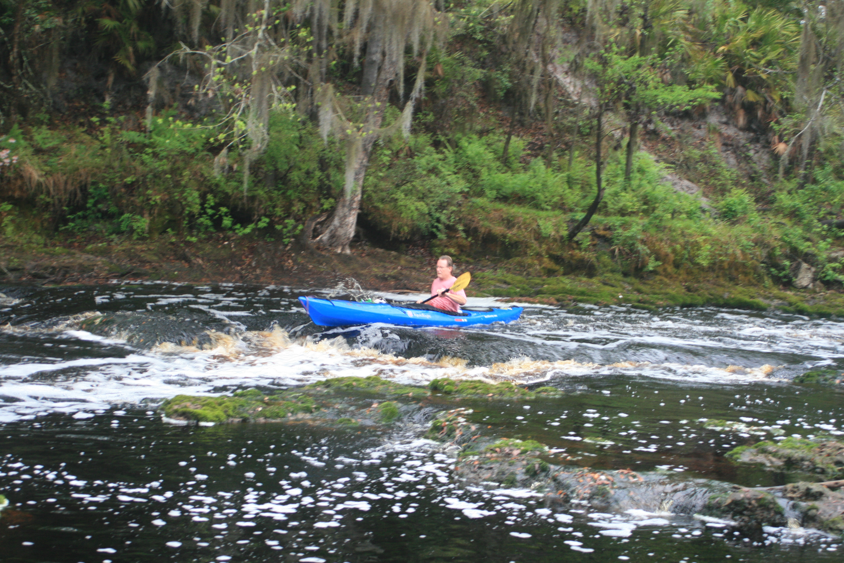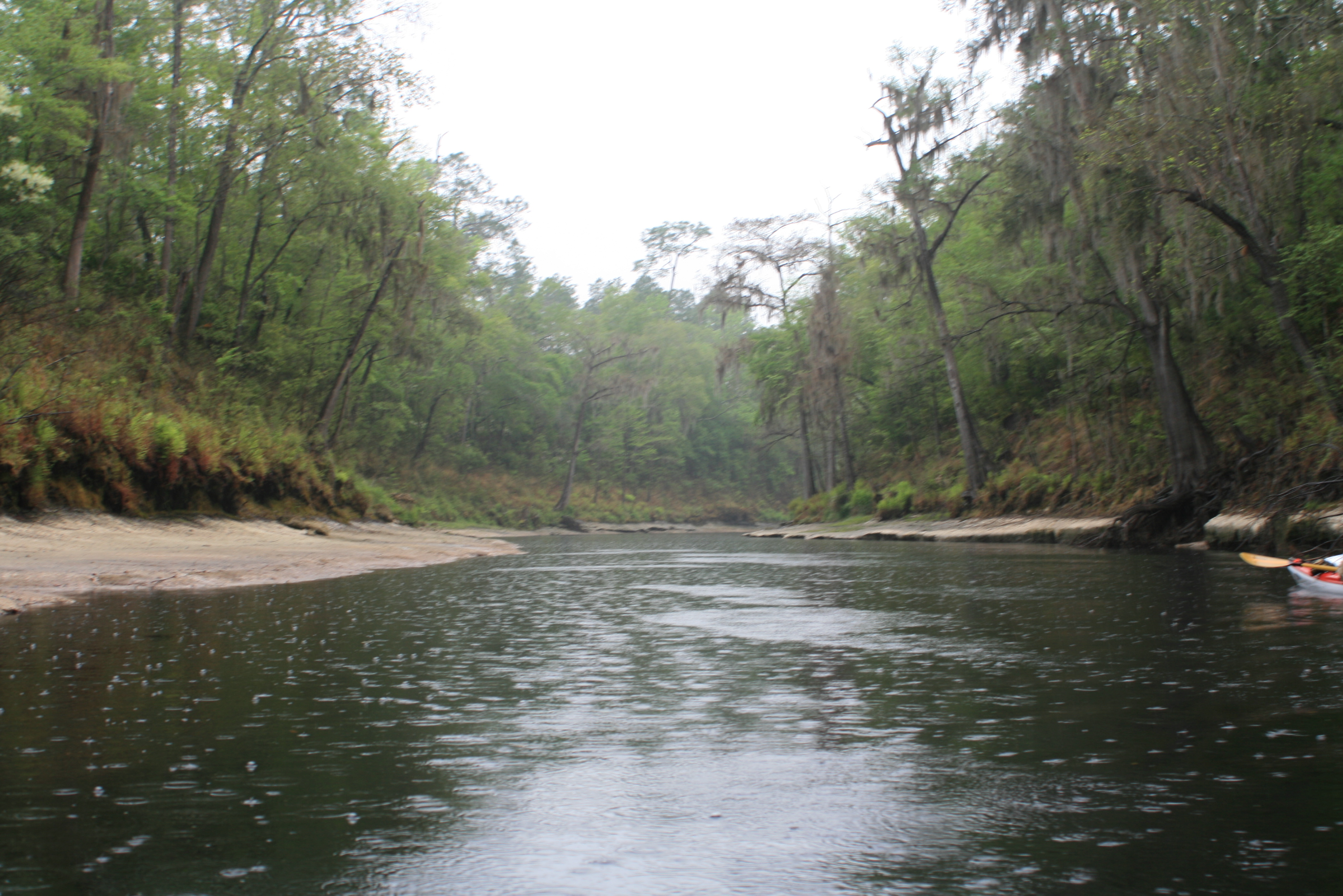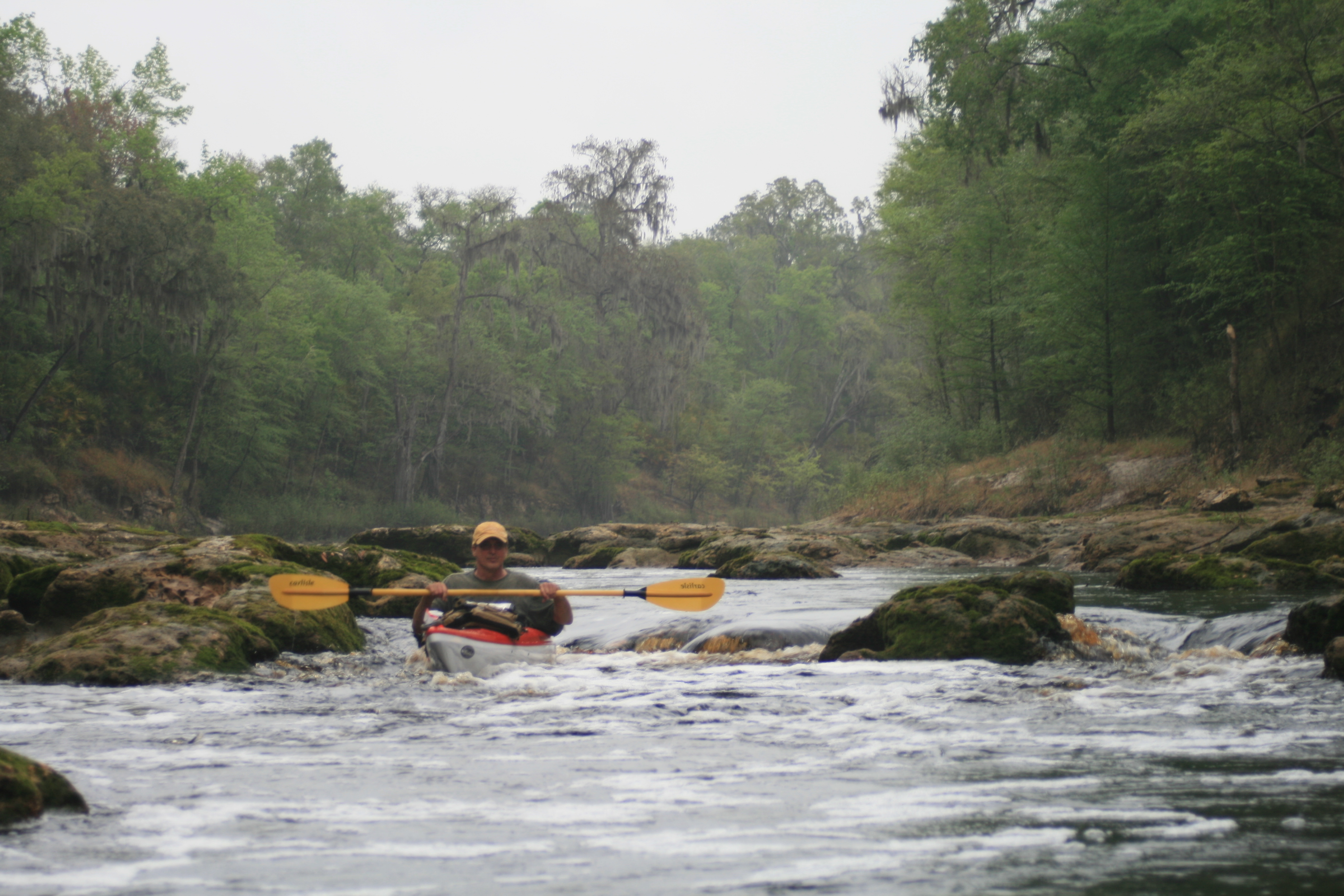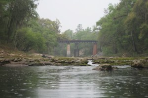Facebook Post; “Fla/Ga Line to Woods Ferry River Camp – 2 days, 52 miles – Rode the Big Shoals rapids above White Springs – passed under hwy 41 and I-75. Lots of character in this part of the river, and lots of rain today – each day overcast but today RAIN. paddle. alls just fine, – ‘feet-up.'”