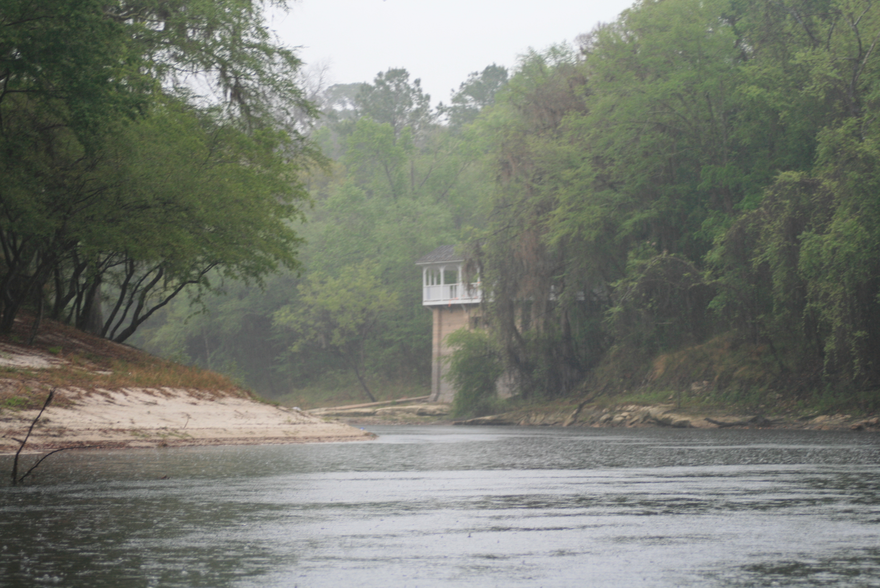 The Suwannee’s current seemed a little more solid than the previous day, but no noticeable changes in the water-marks. The water-table drop had been noticeable through those shoreline marks, but no change through the night – this was good. You can figure a few miles of slow water (pools) just above Florida’s only class III rapids, Big Shoals.