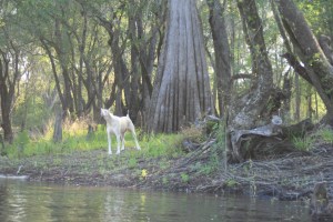 While taking a stretch (trail-break) I noticed a small spring and figured that I might take a walk and take a picture or two deeper in the woods. As I crossed the dew covered ground I sensed something in the distance lurking in my direction, a white object – moving stealth-like – so I slowly (and quietly) stepped across the kayak, and quietly sat – pushing back into the water. I sat motionless watching it’s continued approach.