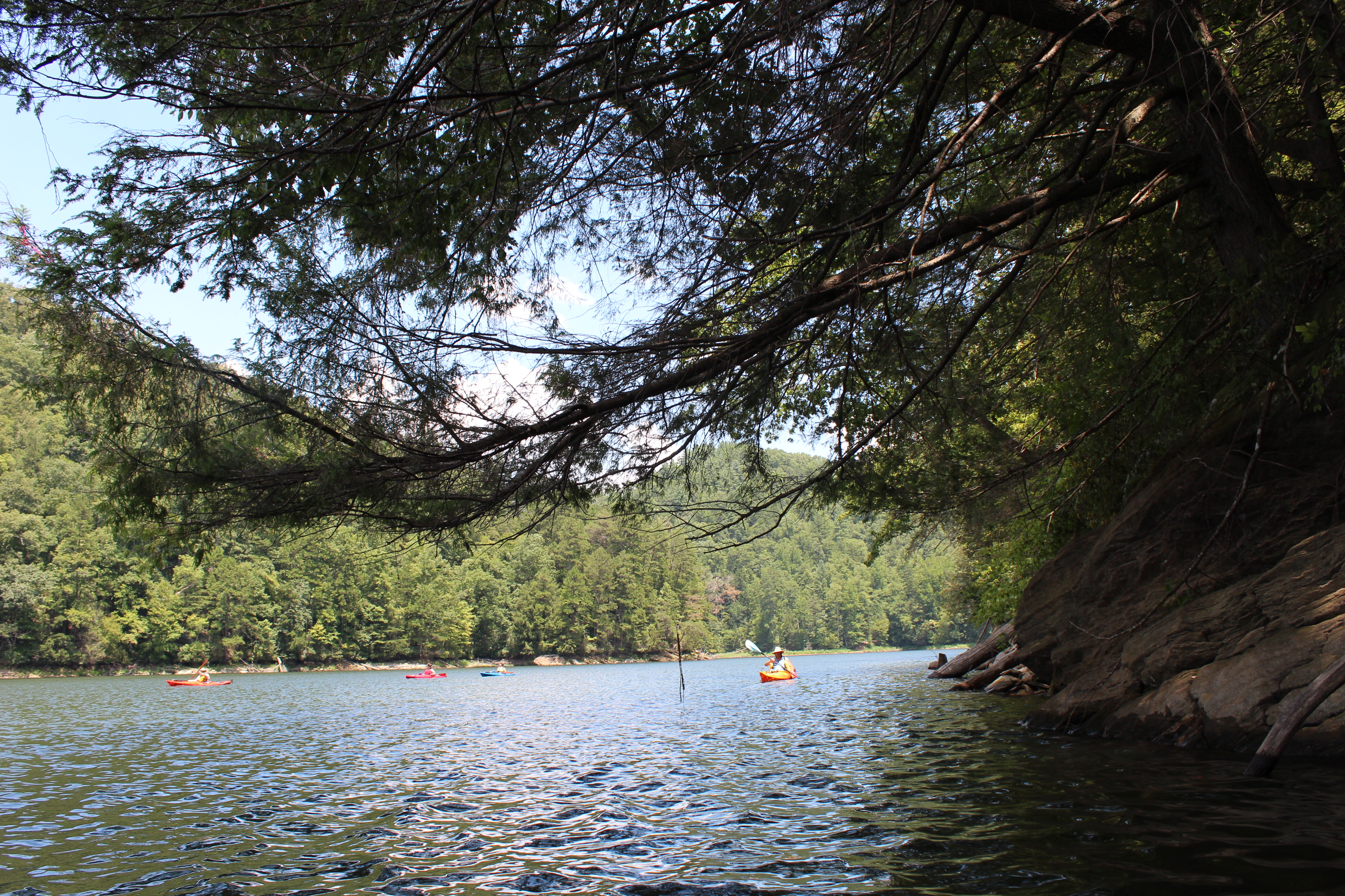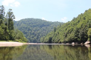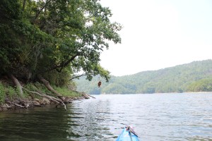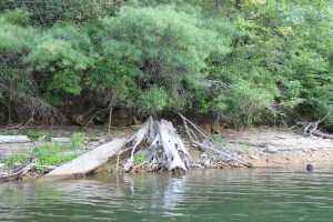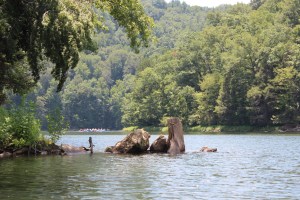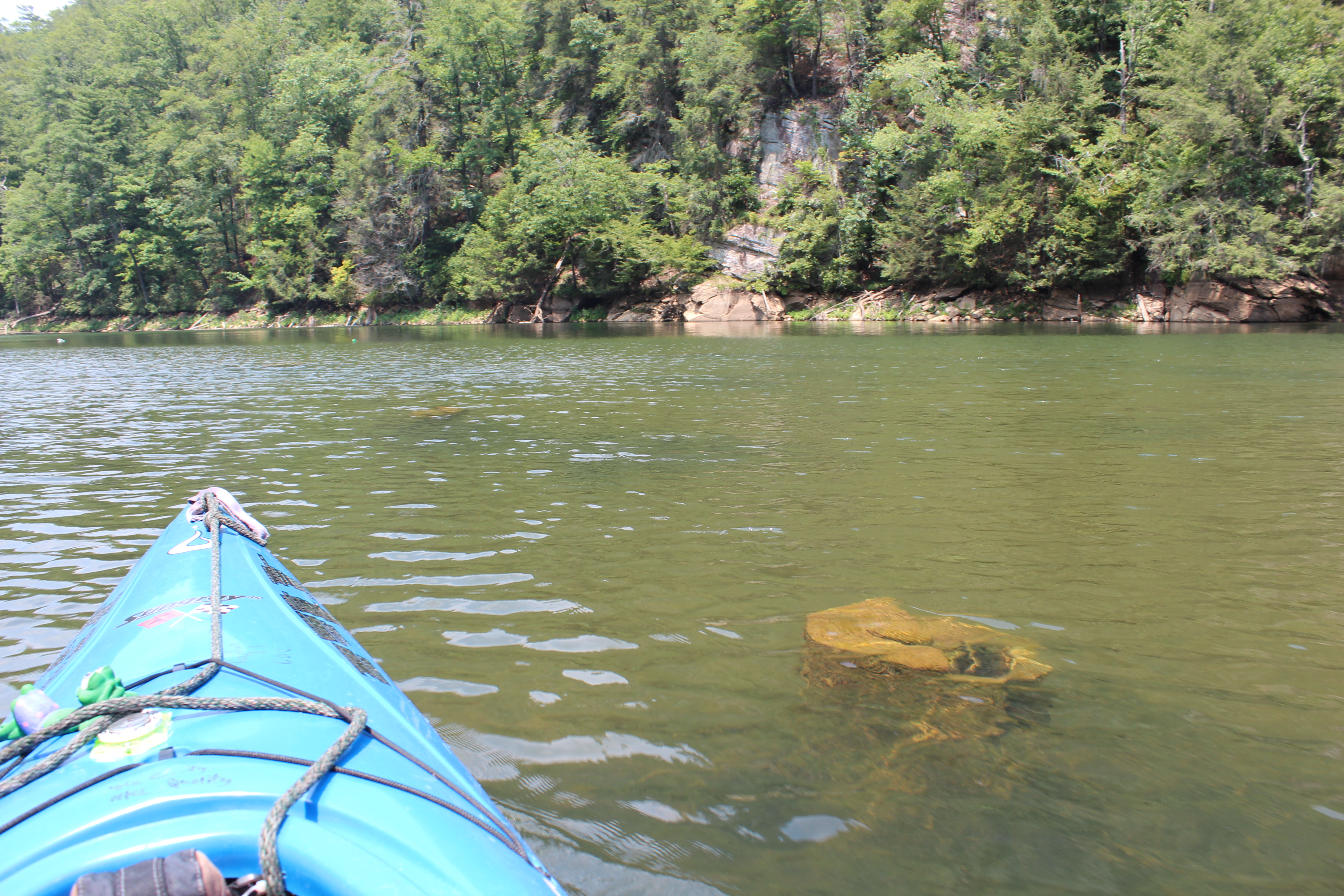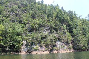 Speaking of exposed, as I stealthily paddled the shoreline from the dam towards the Tallulah river, this one little cove had a couple enjoying the weather ‘in the buck,’ just ‘hanging-out’ around their camp site. Its not the first time I’ve paddled up to such things – and certainly not something I dwell on (or at). I made it right up to them without completely realizing the situation, then as I paddled away through the summer heat I could actually understand their position (no-body’s around! what the heck!!) I say go ahead, set it free……