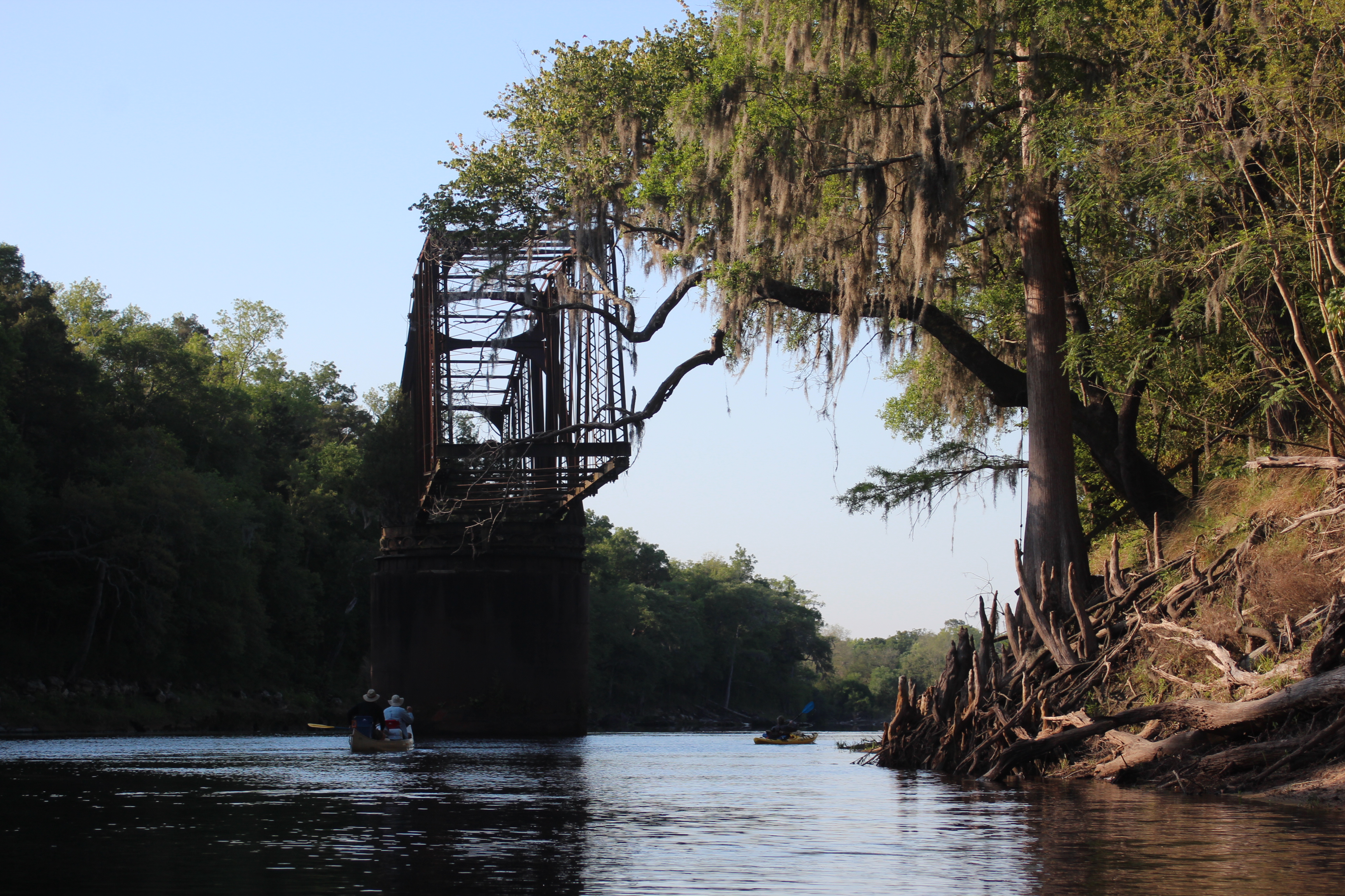In a short distance the long abandoned Live Oak to Perry Railroad (LO&P) trestle stands watch in the middle of the river, it’s base of steel reflects years of neglect – I give it 30 more years before it too succumbs to the Suwannee and tumbles in (also referred to as the Drew Bridge).