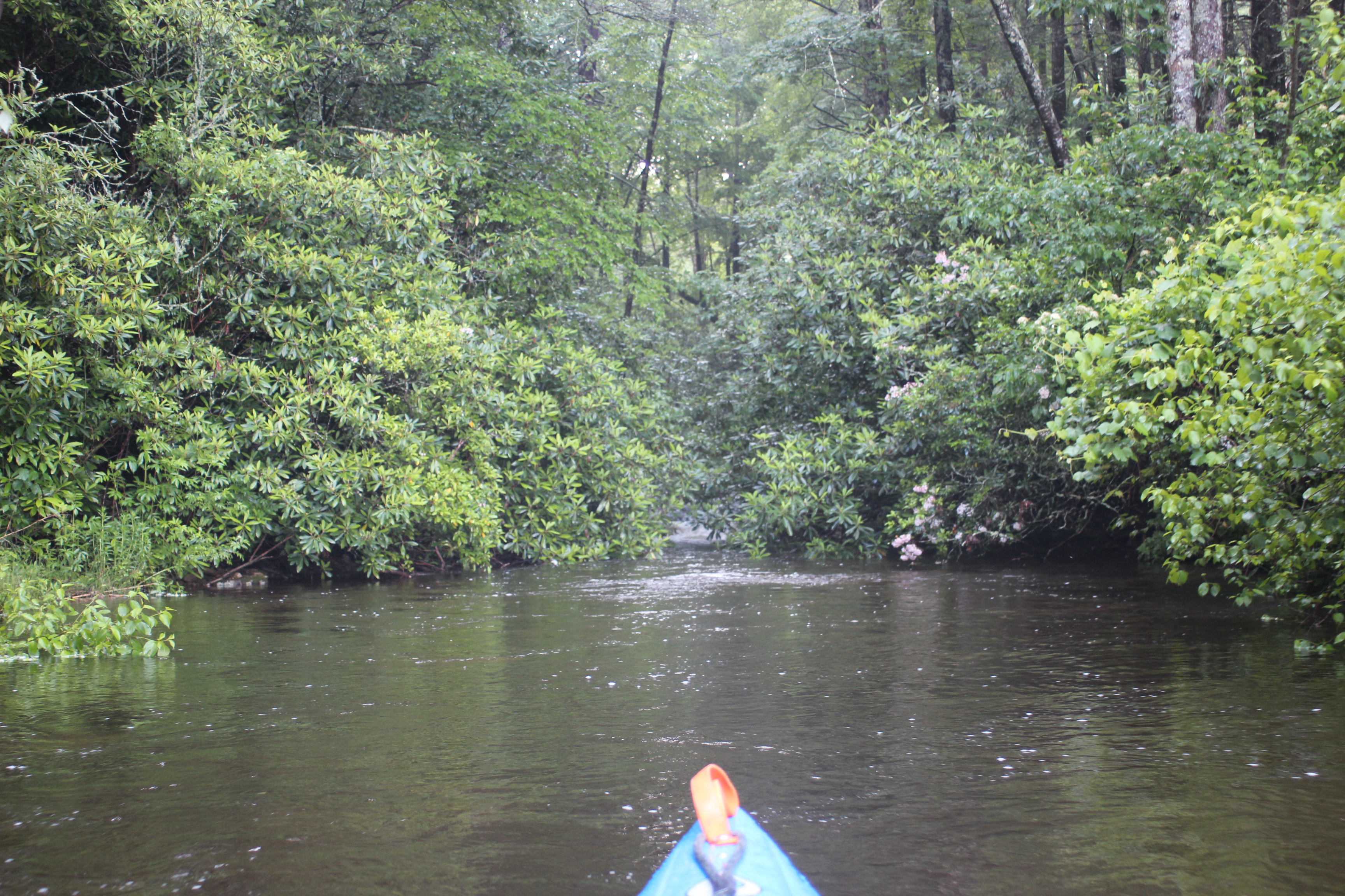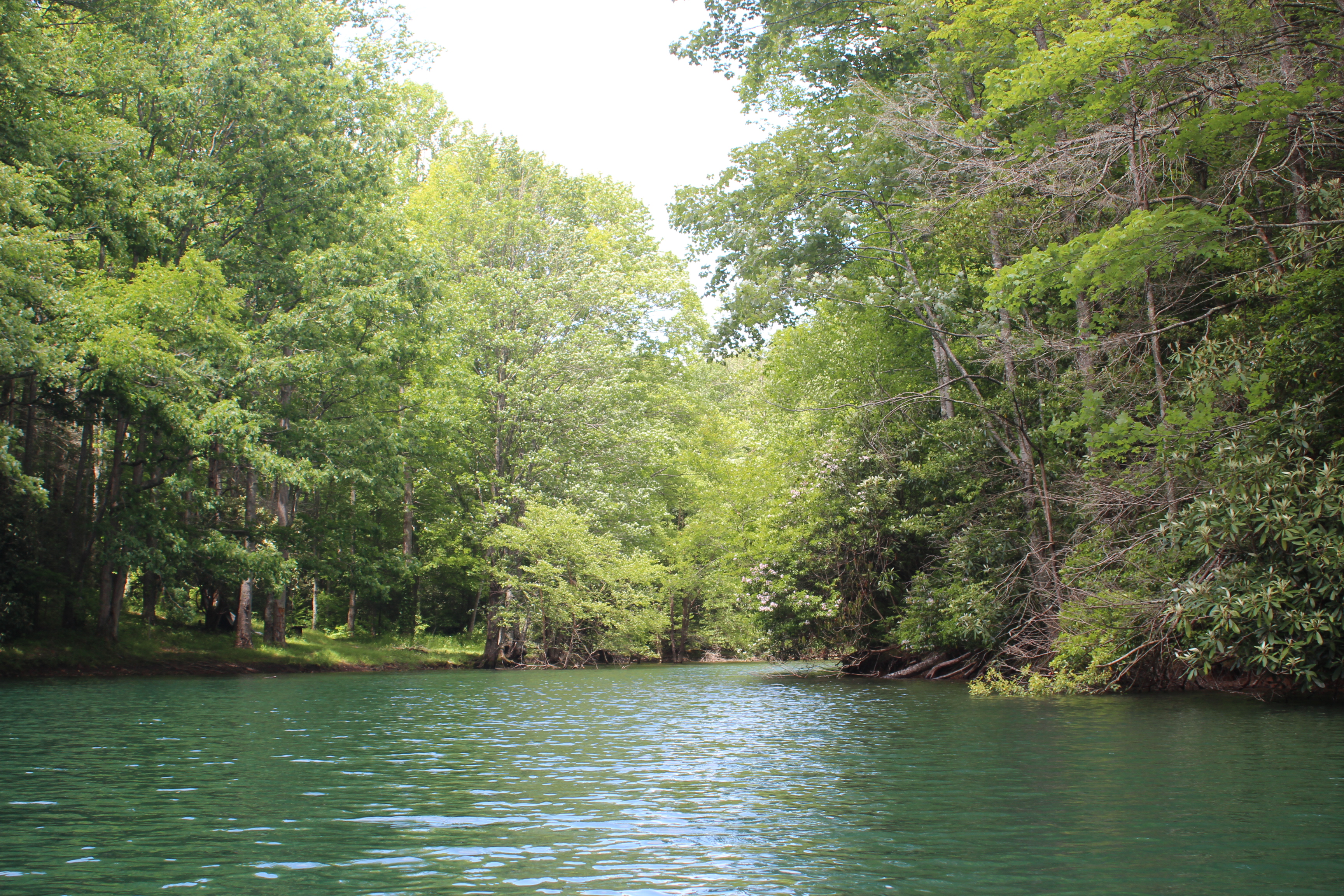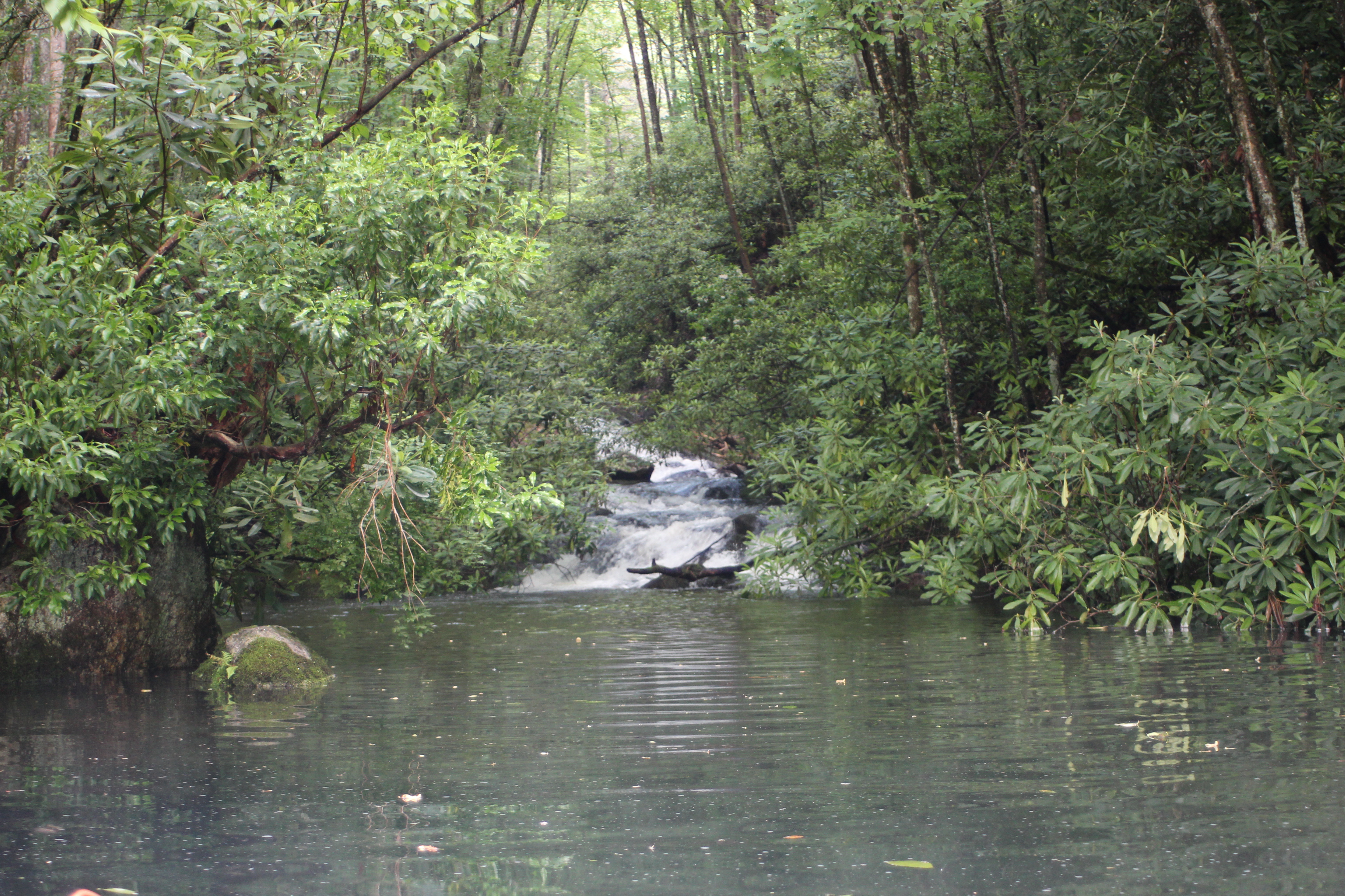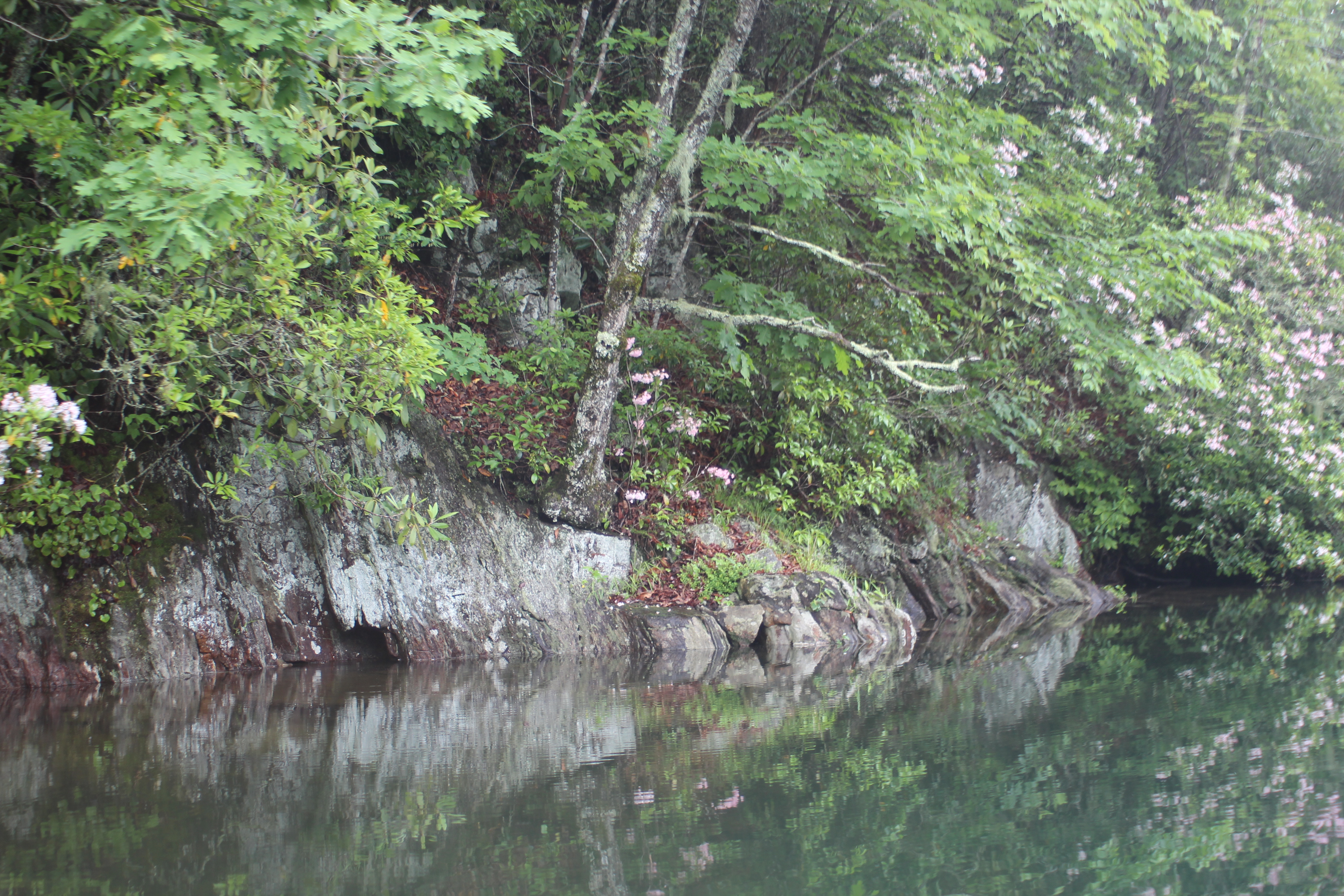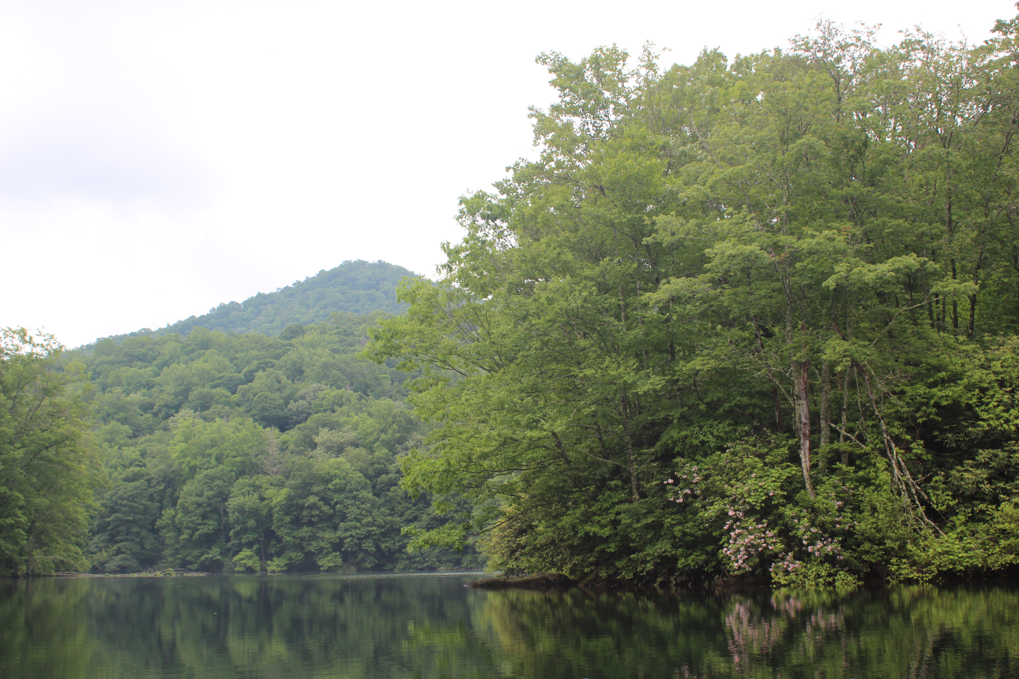 Those sounds of water on Nantahala lake were plentiful – especially on the headwaters end, but the streams were mostly difficult to see behind the heavy rhododendrons.  Touch the water and they were ez to visualize.